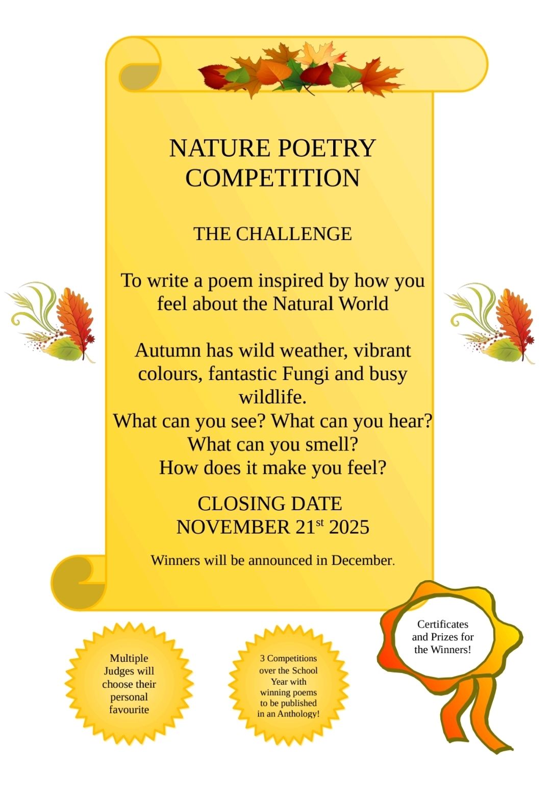 In Autumn we called upon 3 local Primary Schools to challenge their children to write a Nature Poem. We wanted them to get outside, observe the world around them, and talk about what they could see and how they feel about it.